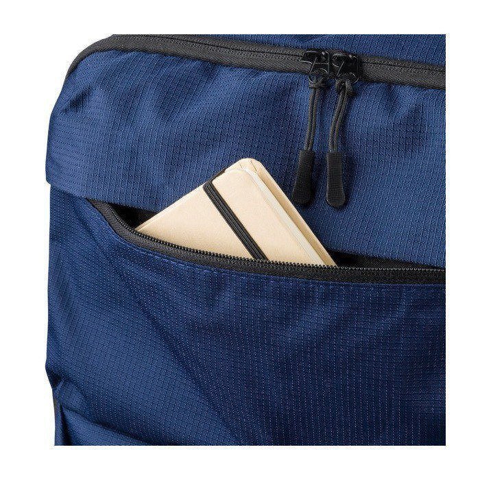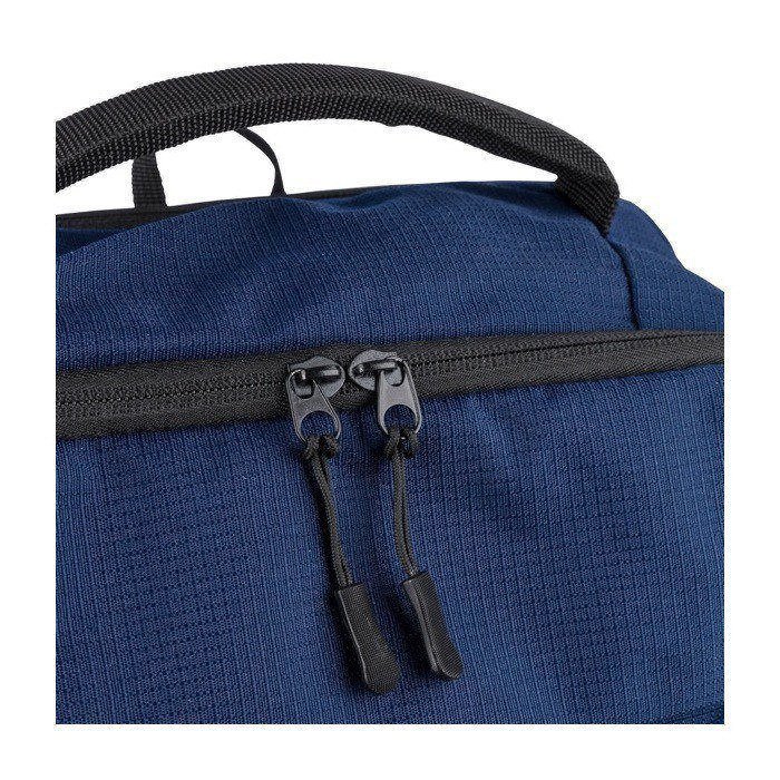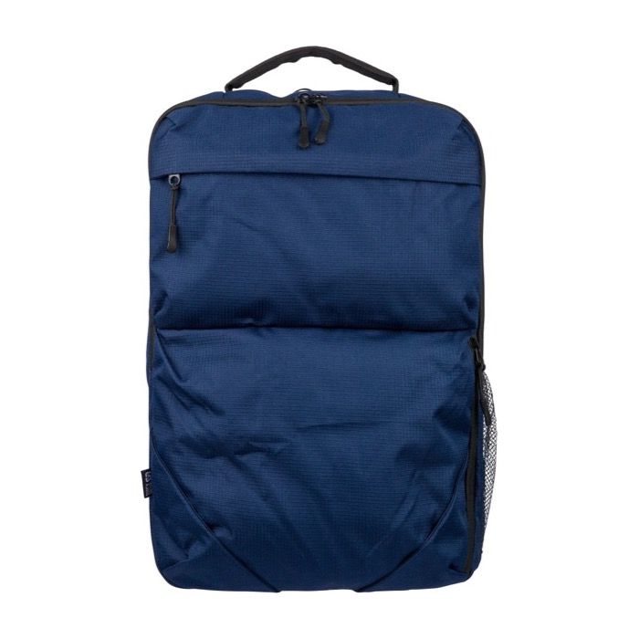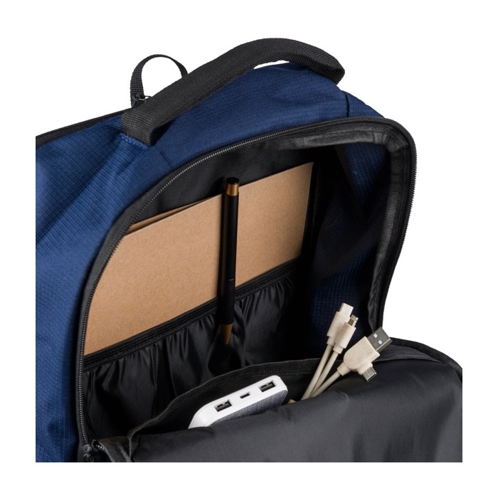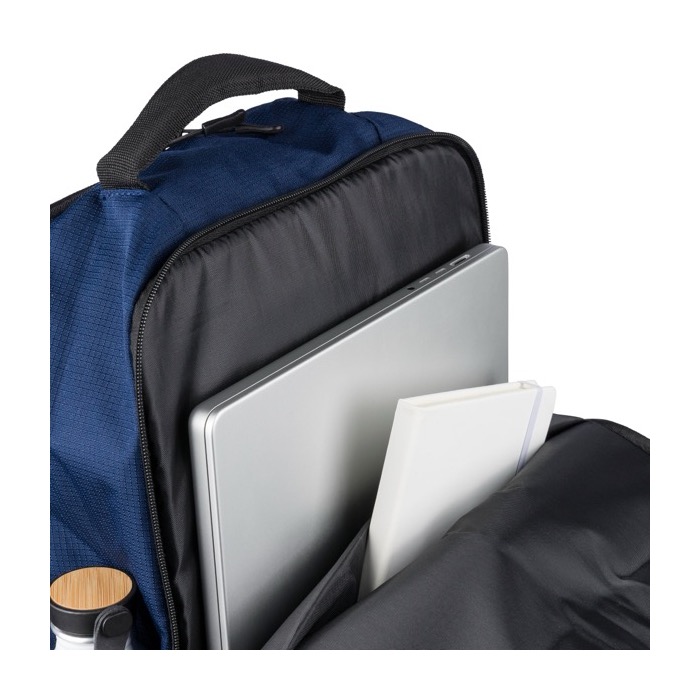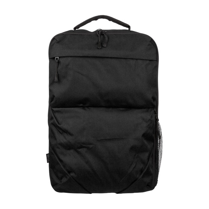 Zaino in poliestere riciclato (rPET) con finitura testurizzata, progettato per i ritmi quotidiani dell'ufficio e degli eventi. Offre una capacità di 20 L suddivisa in due ampi scomparti con zip, di cui uno imbottito per laptop fino a 15 pollici. Include due tasche frontali con zip, una tasca laterale in rete e una maniglia superiore per una presa rapida. Il massimo comfort è garantito dagli spallacci regolabili e traspiranti, dallo schienale imbottito e dalla fascia per trolley. Ideale come regalo aziendale per i team, fiere o attività di branding.