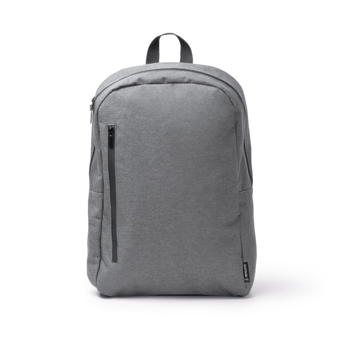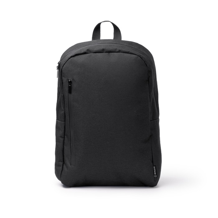 Zaino in plastica riciclata con tessuto 300D e rivestimento in plastica che aiuta a respingere i liquidi. Include cerniere impermeabili e uno scomparto principale con doppia chiusura per organizzare la quotidianità. Comprende una tasca interna per laptop fino a 15" e due tasche extra per accessori, oltre a un’ampia tasca esterna con cerniera ermetica. Aggiunge tasche laterali per bottiglie, schienale e manici imbottiti, nastro riflettente e fascia per trolley. Utile per attività di brand in fiere, onboarding o viaggi aziendali.