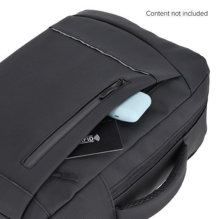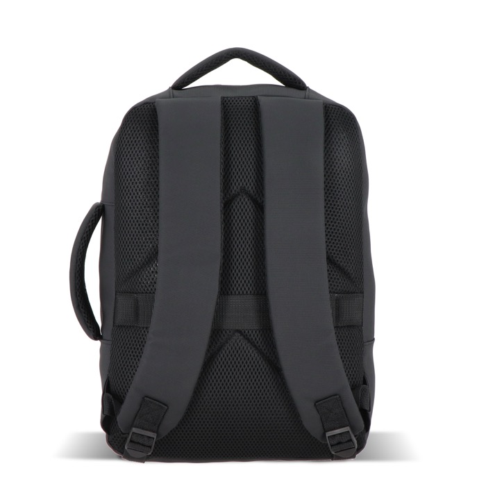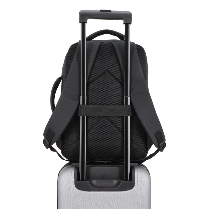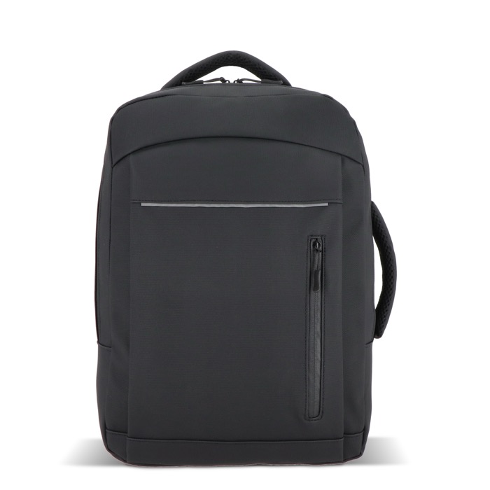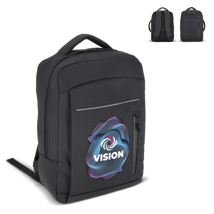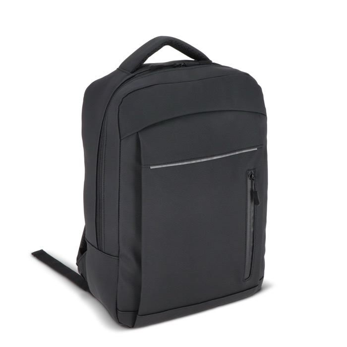 Zaino per laptop in pelle sintetica con fodera 210D, pensato per l’uso quotidiano tra ufficio, visite e viaggi. Può contenere laptop fino a 15,6'' e mantiene il contenuto ordinato grazie all’interno organizzato. Include spallacci imbottiti regolabili, schienale in rete e maniglie superiore e laterale per diverse modalità di trasporto. Aggiunge fascia per trolley, dettagli riflettenti, tasca frontale con cerniera e tasca nascosta per oggetti di valore. Opzione pratica per iniziative HR ed eventi aziendali con logo.
