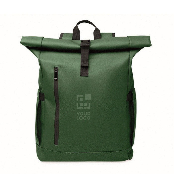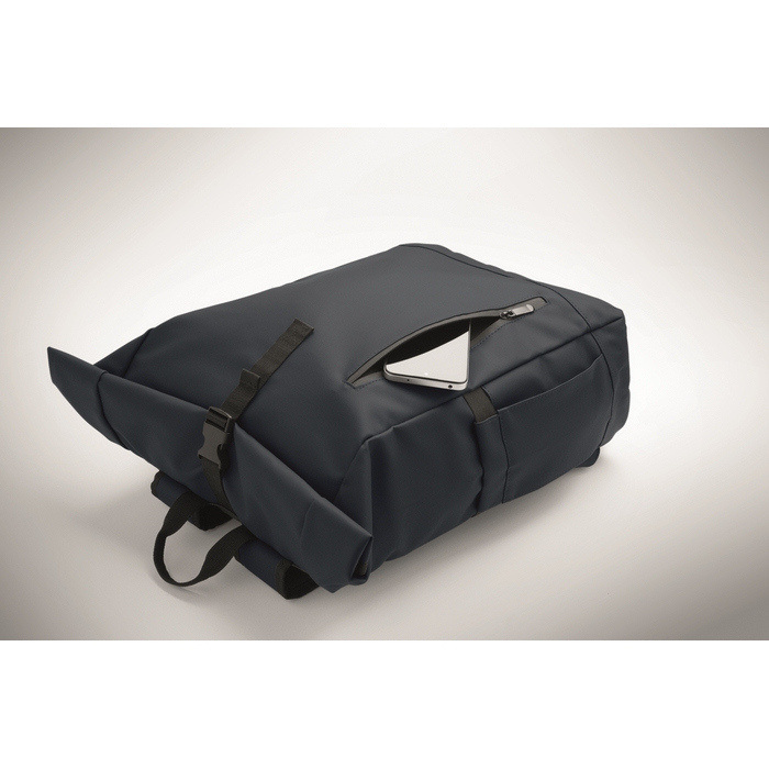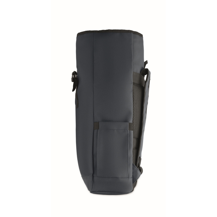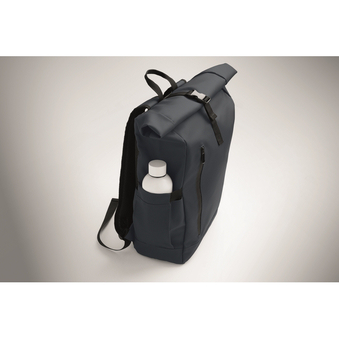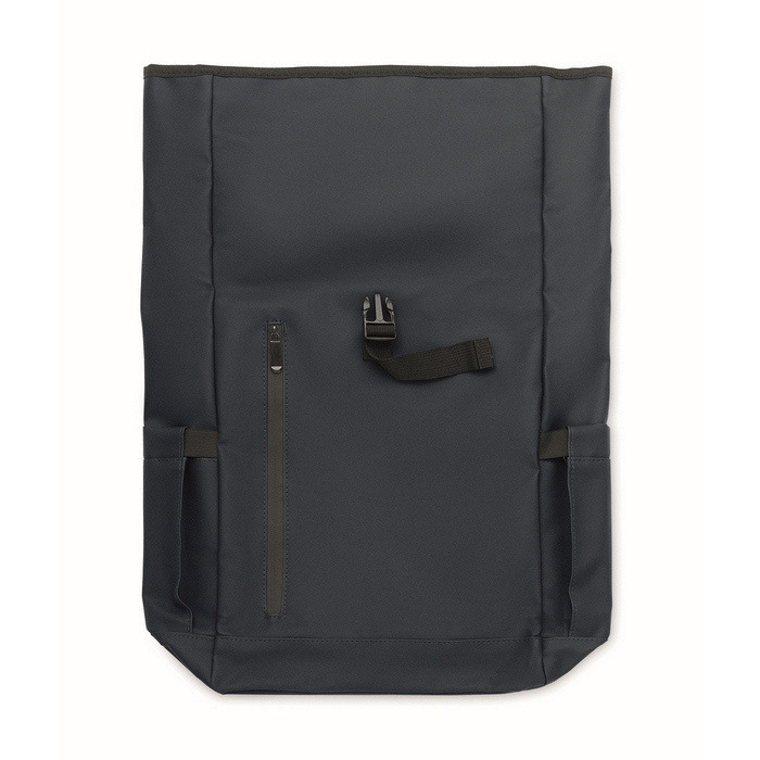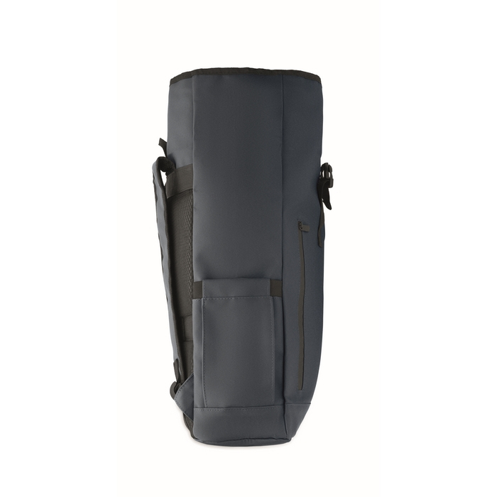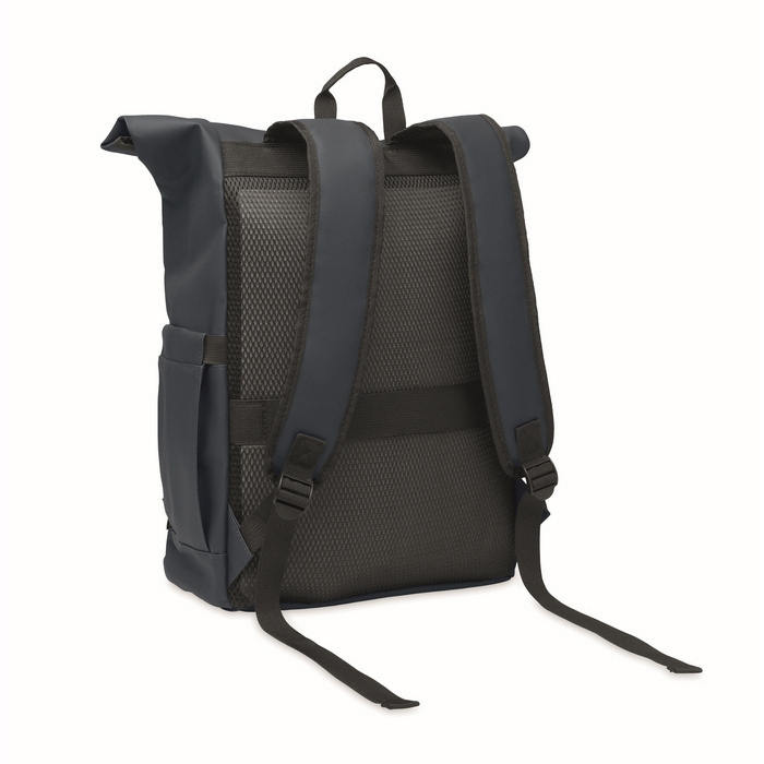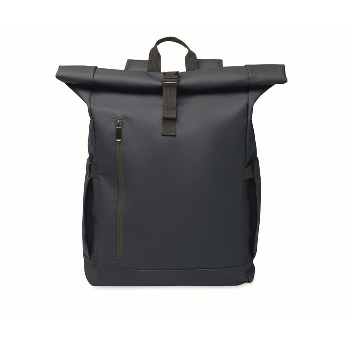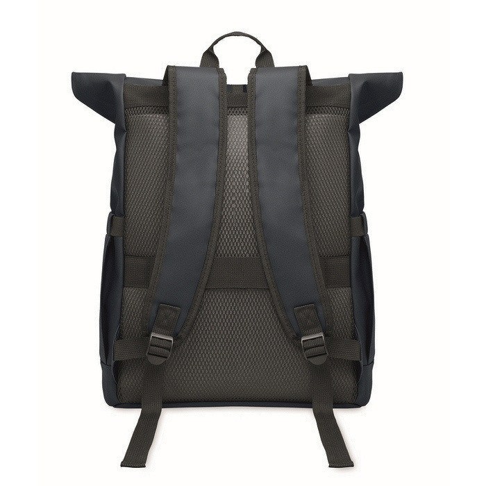 Zaino rolltop per laptop 15'' in RPET 600D rivestito PU e fodera in poliestere RPET. Schienale imbottito in rete, tasca con zip e tracolla per trolley. Tracolla imbottita con finitura interna in rete.