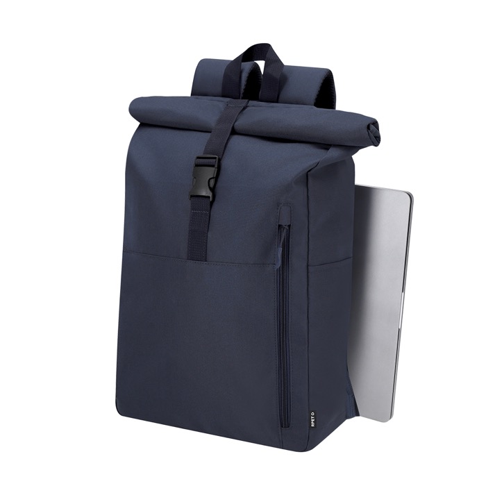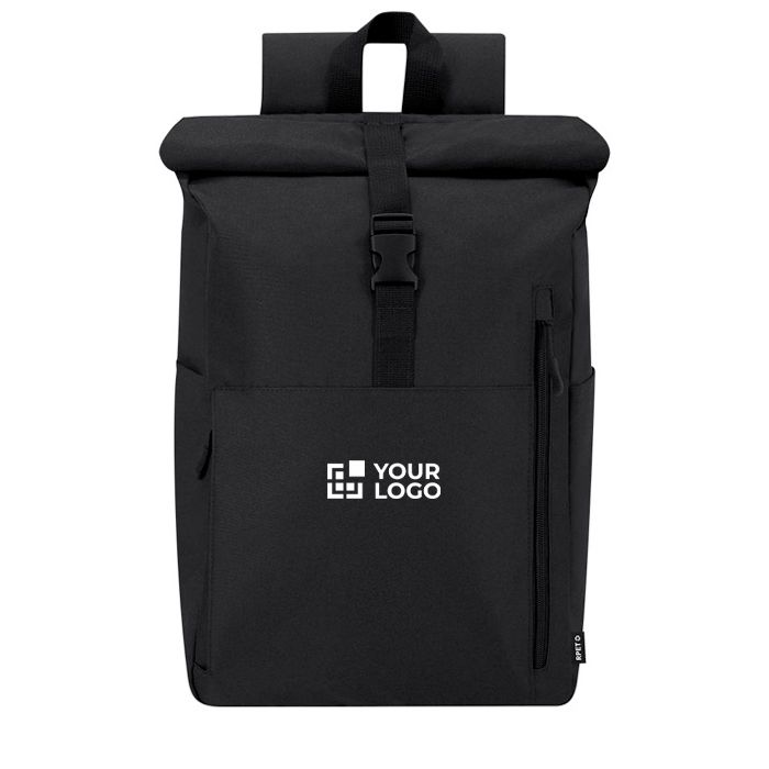 Zaino realizzato in resistente RPET 300D con chiusura arrotolata e fibbia. Dotato di due tasche frontali, una tasca posteriore con accesso laterale e due tasche laterali aggiuntive. Ampio scomparto interno con vano imbottito per laptop fino a 15 pollici. Spallacci e schienale imbottiti. Include fascia per il trasporto su trolley o valigia, ideale per viaggi e spostamenti.
