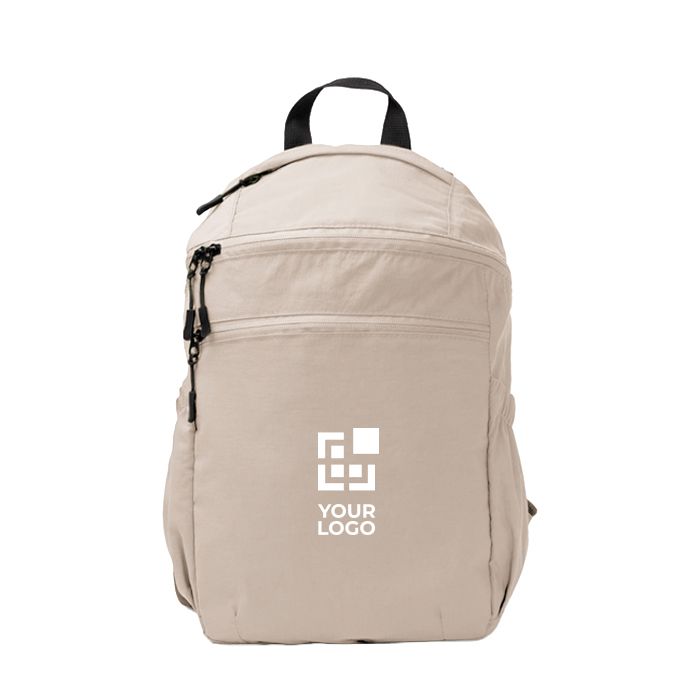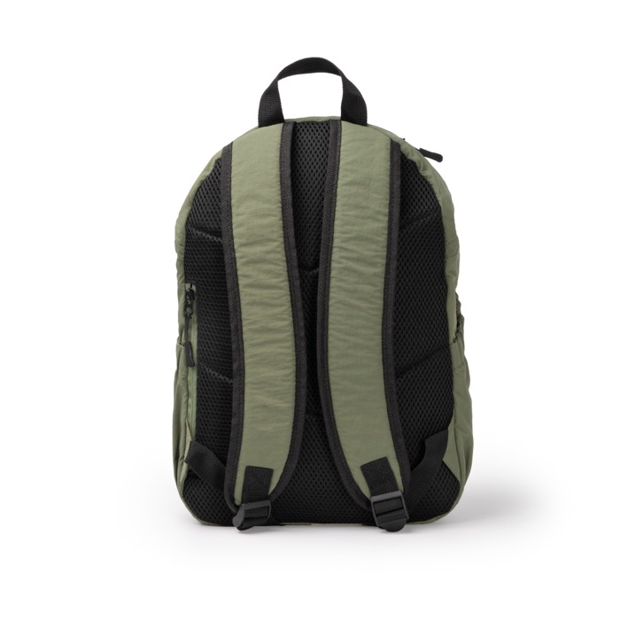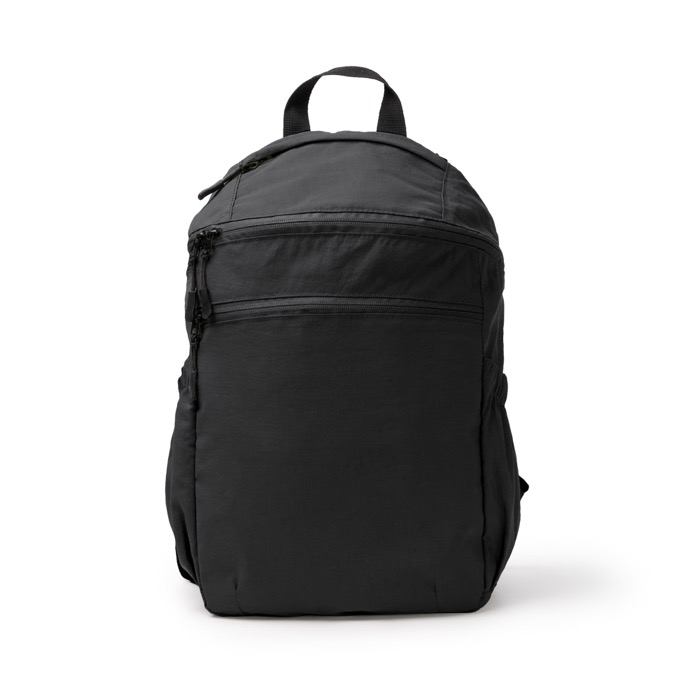Zaino unisex in nylon Ripstop Taslon, pensato per l’uso quotidiano in ufficio e negli spostamenti. Include tasche laterali con regolazione elastica per trasportare le bottiglie con maggiore stabilità. Sul frontale integra uno scomparto con cerniera e, nella parte superiore, una tasca aggiuntiva per accessori a portata di mano. All’interno aggiunge una tasca imbottita per trasportare tablet fino a 10". Schienale e spallacci imbottiti per migliorare il comfort nei tragitti lunghi. Utile per iniziative di benvenuto ed eventi aziendali.