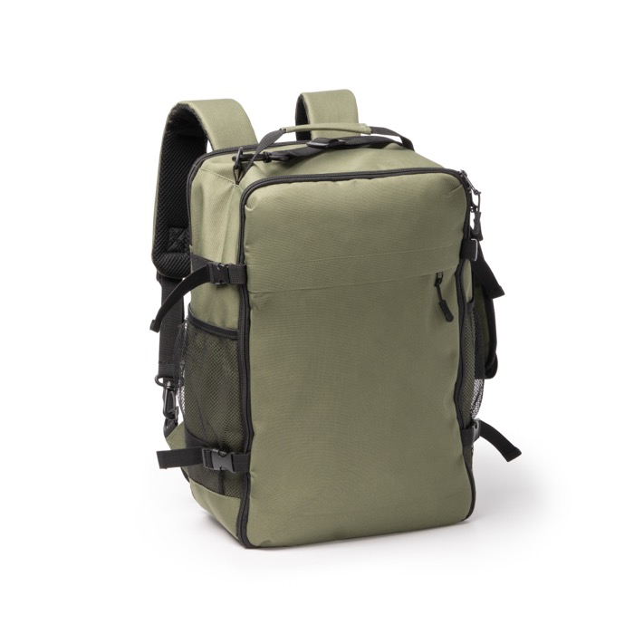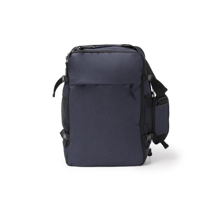 Zaino da viaggio in plastica riciclata 600D con apertura a 180° per accedere rapidamente all’interno. Include un ampio scomparto principale con divisori di varie dimensioni che aiutano a organizzare vestiti e accessori, e fibbie laterali regolabili per stabilizzare il carico. Aggiunge una tasca frontale con zip per gli oggetti di uso frequente e uno scomparto posteriore imbottito per trasportare documenti o portatile con maggiore protezione. Include lati in rete per bottiglie, tasca antifurto e fascia per trolley. Opzione pratica per viaggi aziendali e attività di brand.