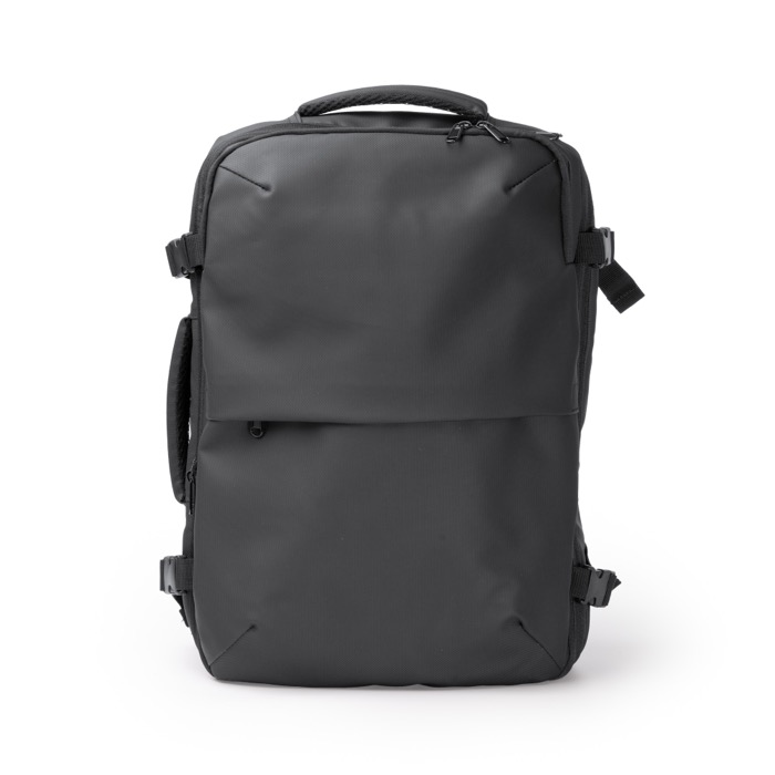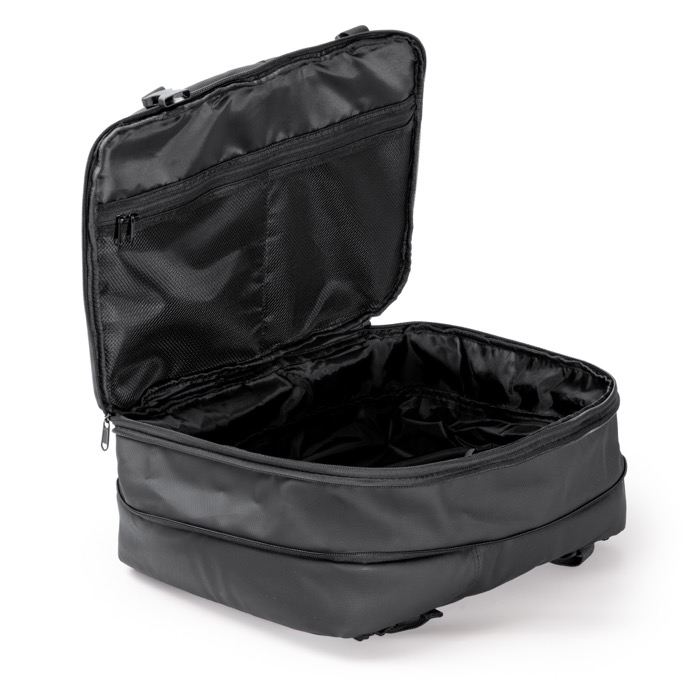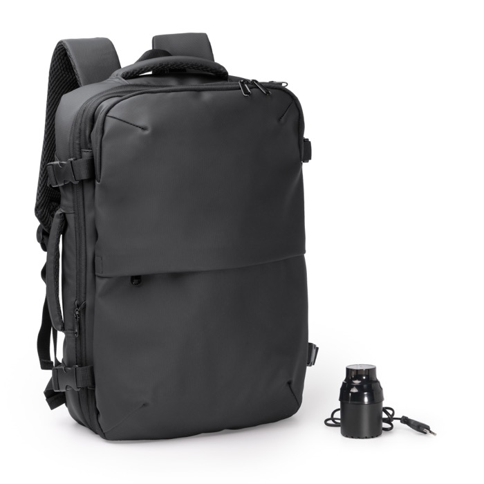 Zaino in pelle sintetica con formato espandibile e sistema di compressione sottovuoto tramite pompa elettrica da 30W, pensato per ottimizzare lo spazio durante viaggi e spostamenti di lavoro. Include uno scomparto principale con due tasche interne indipendenti con cerniera e tessuto a rete per organizzare gli accessori. All’esterno aggiunge una tasca superiore con spazio per laptop fino a 17" e una tasca invisibile con chiusura. Aggiunge fibbie laterali di regolazione, fascia per trolley e schienale e spallacci imbottiti. Opzione pratica per azioni di benvenuto, fiere o dotazione interna.